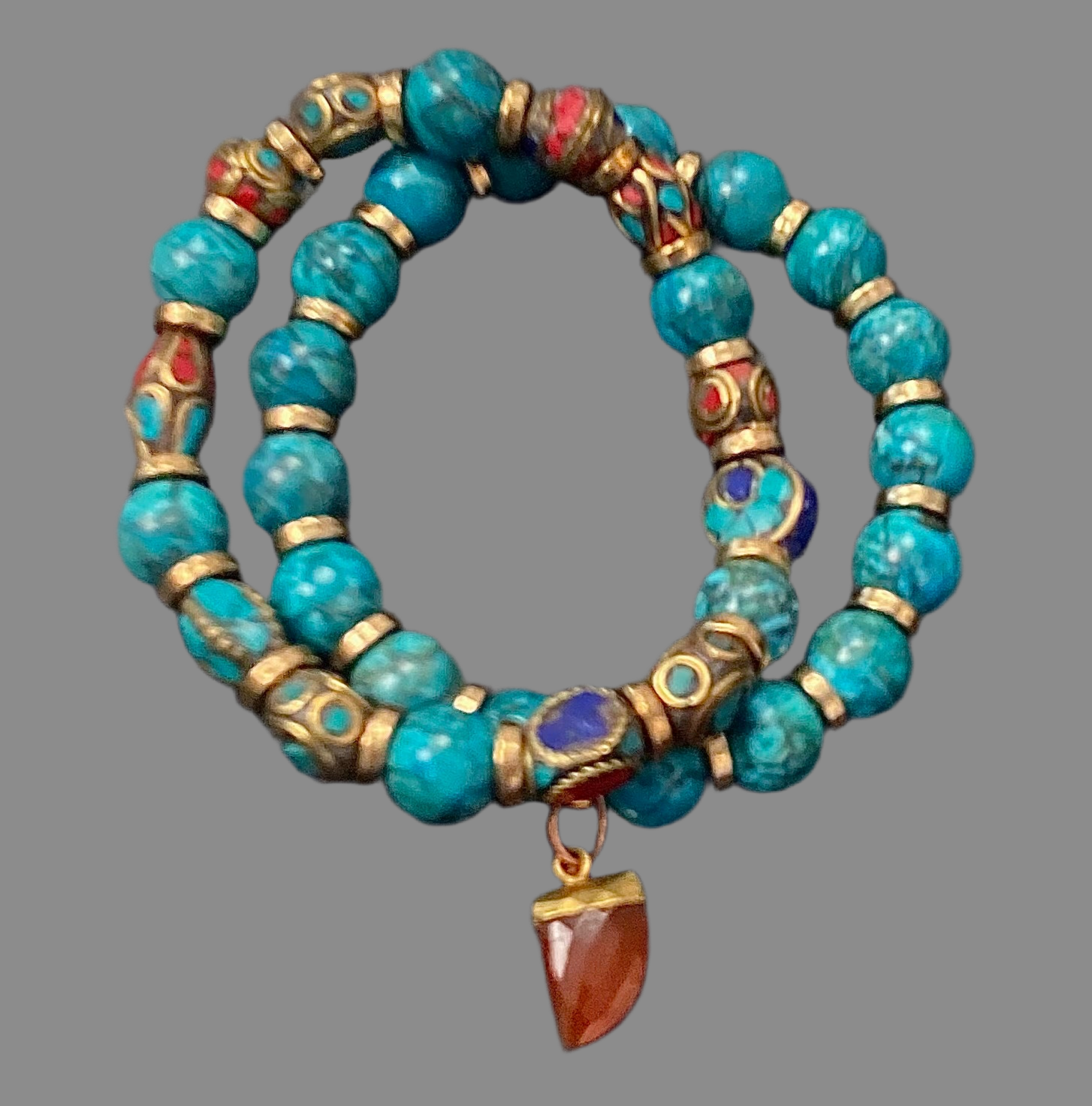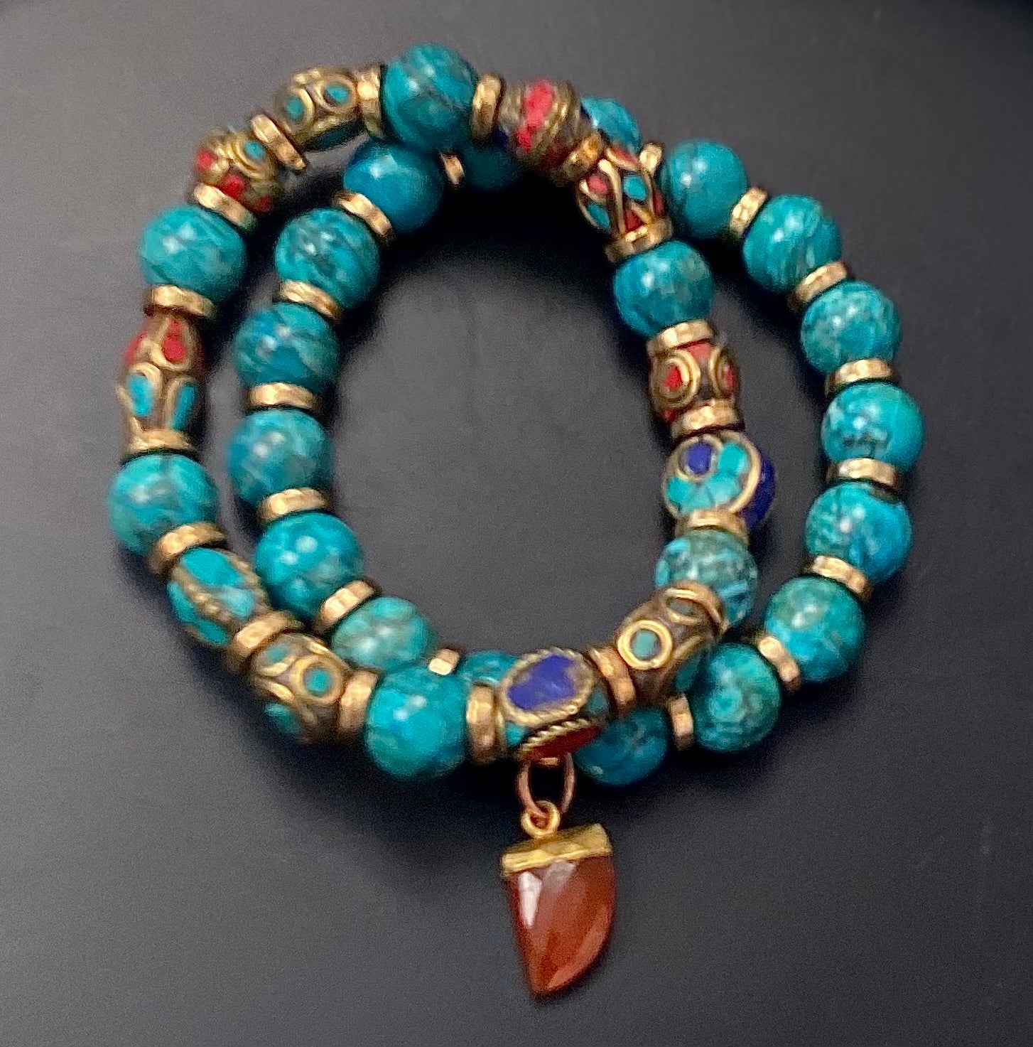 10mm African turquoise bracelets, one with a carnelian pendant and the other with Tibetan turquoise accent beads.